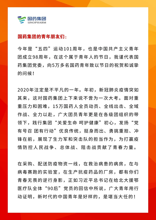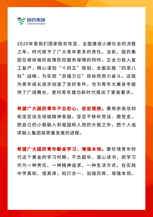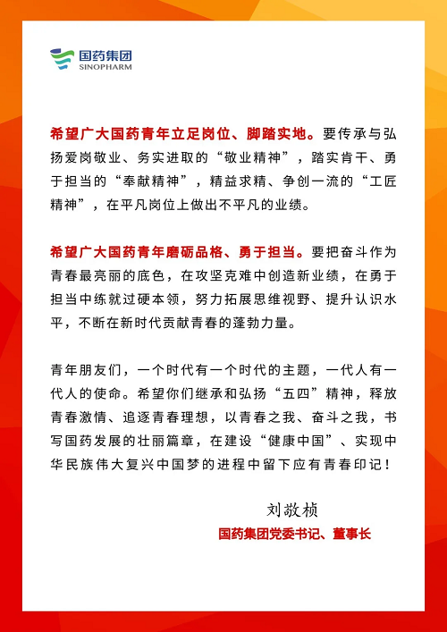 國(guó)藥集團(tuán)黨委書記、董事長(zhǎng)劉敬楨同志2020年“五四”青年節(jié)寄語(yǔ)